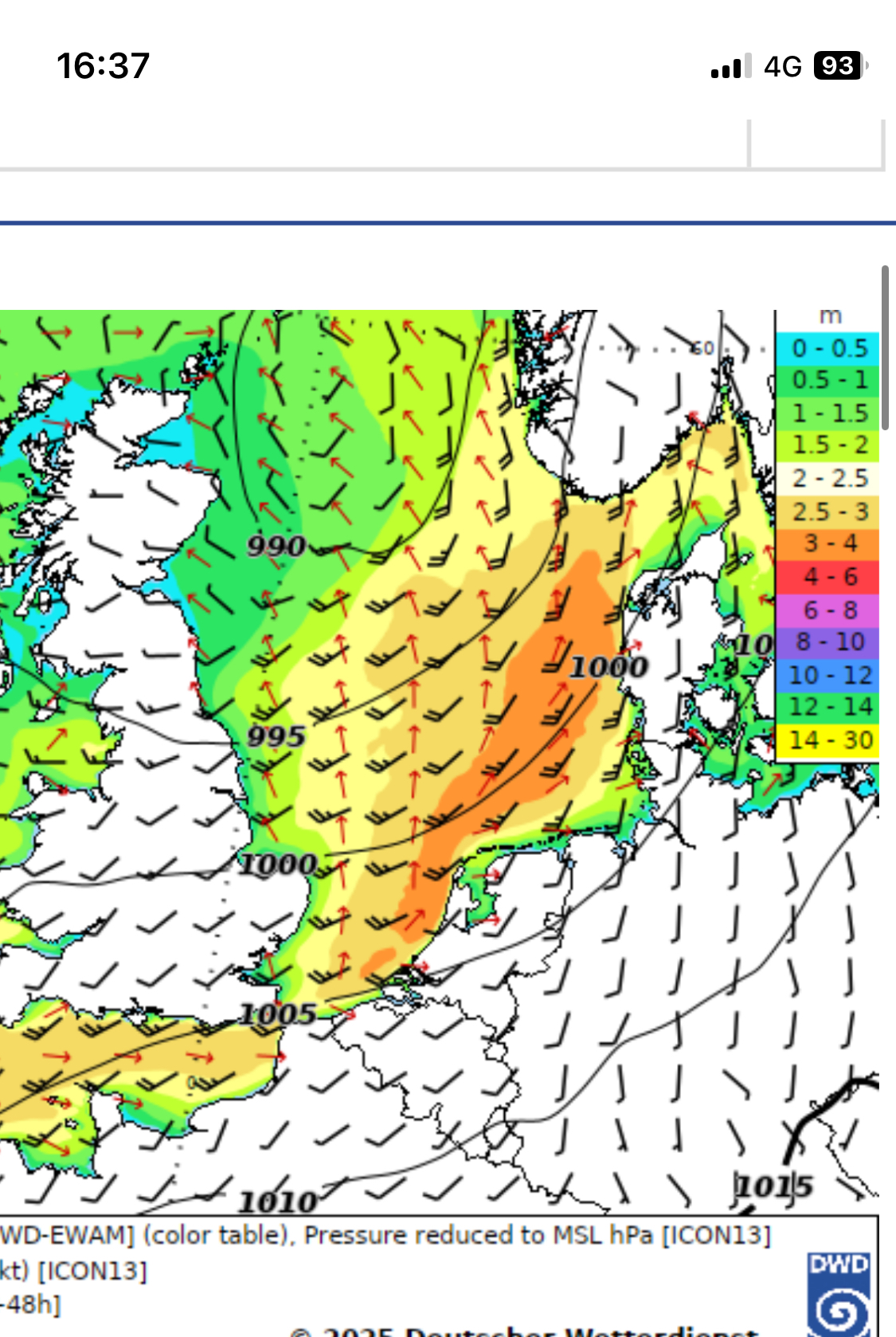Toch aardige wind op de kaartjes, maar dus niet genoeg richting de kust om golven in ZW Nederland te produceren later op de dag?