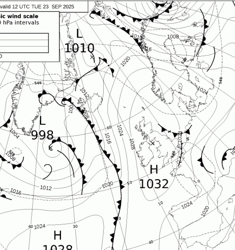 Goed te zien de buienstraat die dinsdag van noordoost naar zuidwest in de zuidelijke Noordzee ligt. Daarboven een koufront die afzwakt, maar waar wel de wind direct achter iets gaat toenemen en draait naar NNO in plaats van de gunstige O/ ONO de hele ochtend en deel van de middag. Beetje op tijd gaan dus als dat kan!