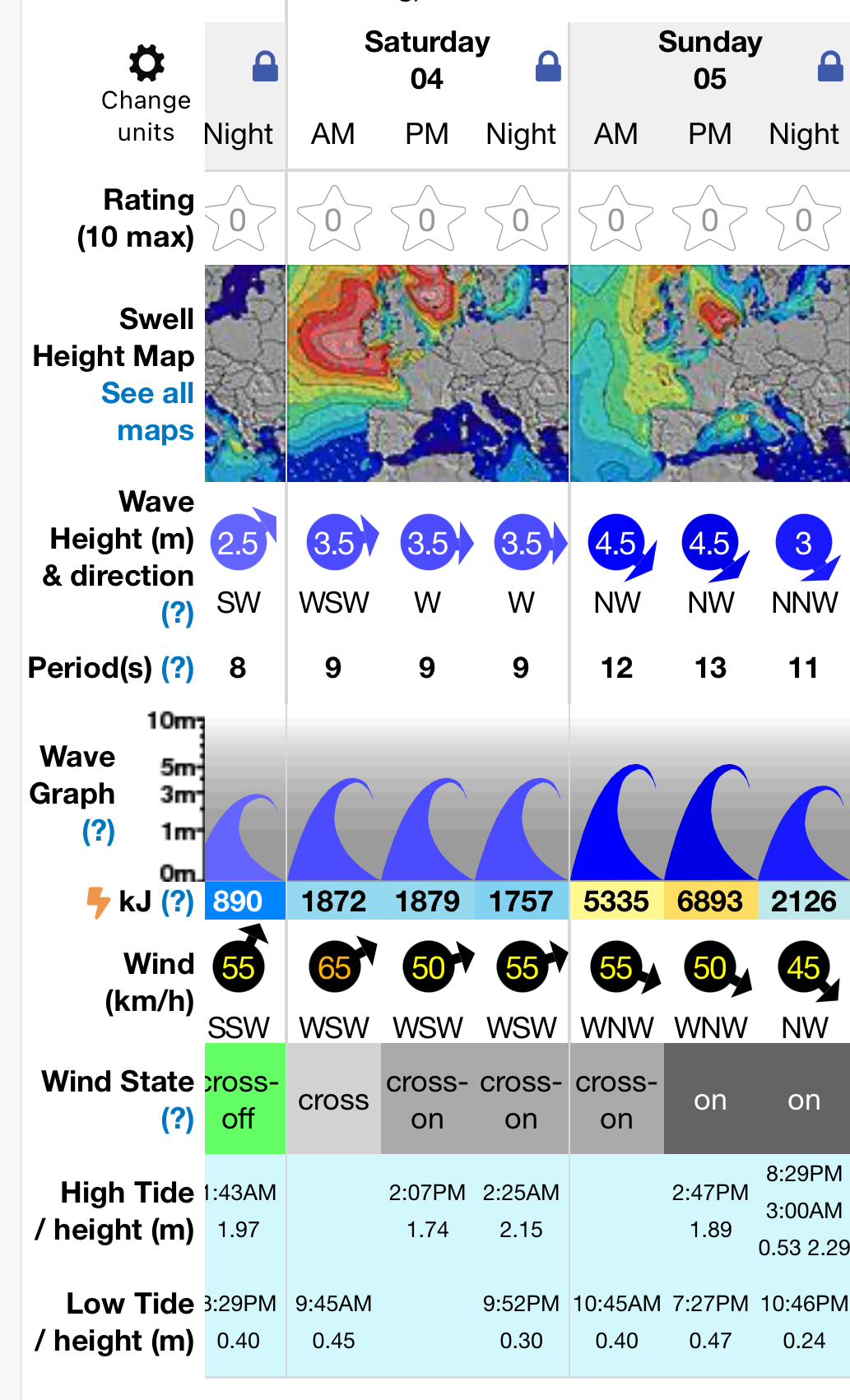 Boven zee hangt evenwijdig aan de kustlijn een strook met buien waardoor de wind aflandig is en ook een groot deel van de dag aflandig blijft. Mooie cleane surf dus, maar wel met het lage getijde in alle zuidwestregio’s. Voor Zeeland kan het nog wel de moeite zijn om te gaan met helemaal laagwater. In Belgie komt er een stuk minder surf door en is het wellicht beter om te wachten tot begin middag het tij opkomt. Daar is dat al vrij snel, want laagwater valt van 10 tot 12 uur. De wind zal rond 14u wel al iets toenemen maar nog steeds zwak en ONO. Pas tegen 16u als alle buien van zee weg zijn (check de buienradar) gaat het ineens harder waaien en is het mooie er al snel af. Dat is overal het geval, behalve in N-H blijft het op spots rond Zandvoort en Egmond lange tijd schuin aflandig en en nog langer de moeite. Uiteraard kan daar vroege ochtend ook nog even, want het is nog niet meteen helemaal laagwater. Hoewel laagwater vaak net zo goed breekt als je helemaal achterin ver de zee op peddelt. Zeker op alle spots in Z-H vanaf Noordwijk en nog wat beter Wassenaar, Scheveningen en alle opgangen tot aan Hoek van Holland. De twee zuidelijke spots aan de andere kant van de waterweg hebben het nadeel bij laagwater niet zo best te breken. Maar kan op zich wel en anders kan het nog steeds als het tij eenmaal binnen begint te stromen, een uur voor de wind er in komt. Eigenlijk is het dan maar een uurtje echt mooi, maar blijft zeker ook daarna nog wel de moeite dankzij de 1,3m hoge swell met 8 tot 10 seconde swellperiode.